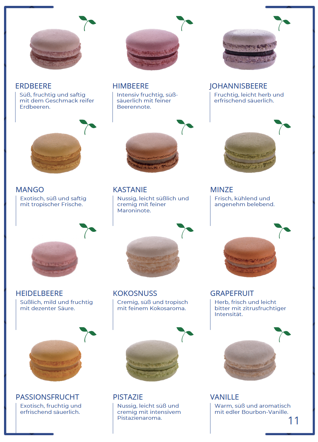 Verschaffen Sie sich einen ersten Eindruck von unserem Sortiment ausgewählter französischer Macarons. In unserem Produktkatalog finden Sie detaillierte Informationen zu Geschmacksrichtungen, Sorten und Verpackungsoptionen – ideal, um die passende Auswahl für Ihr Unternehmen zu treffen.